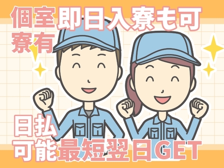 シール貼り/棚卸/運搬/搬入/工場内作業/軽作業スタッフ/構内作業/組立/組付/プレス/加工/梱包/包装/仕分け/検品/検査/チェック/ピッキング/ラベル貼り/ボタンを押すだけ/食品工場/食品製造/加工/ライン作業/工場/手のひらサイズ/住み込み/寮完備/社宅/寮費無料/キレイな1R/カップル寮/家族寮/広めの寮/即入寮/スグ入寮/待機寮完備/社会保険完備/社員登用制度有/研修あり/送迎/駅チカ/自転車通勤/バイク通勤/交通費全額支給/交通費支給/昇給制度有/賞与/未経験歓迎/経験不問/経験者優遇/フリーター歓迎/学歴不問/友達と応募可能/WEB面接/事業所面接/リモート面接/高収入/高時給/週払い/日払い/前払い/大量募集/急募/スグ就業/スグ面接/選考緩い/男女活躍/女性活躍/20代活躍中/30代活躍中/若手活躍中/日勤/2交替/3交代/土日休み/土日祝休み/平日のみ/5勤2休/4勤2休/GW有/夏季休暇有/残業時間20時間以下/残業時間20時間以上/カップル同シフト/単身就業カップル入寮/転勤なし/出稼ぎ/安定/モノづくり/工場/寮環境がいい/職場環境がいい/キレイな職場/人間関係がイイ/離職率少ない/定着率がイイ/長期/倉庫内作業/簡単/カンタン作業/コツコツ作業/モクモク作業/単純作業/サポート/製造/製造スタッフ/製造補助/オペレーター/自動車部品/電子部品/半導体/物流/倉庫/管理/電子部品/男性/冷暖房完備/空調完備/クリーンルーム/屋内作業/在宅面接/オンライン面接/電話面接/履歴書不要/来社不要/工場内作業/期間従業員/自動車部品