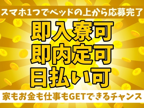 シール貼り/棚卸/運搬/搬入/工場内作業/軽作業スタッフ/構内作業/組立/組付/プレス/加工/梱包/包装/仕分け/検品/検査/チェック/ピッキング/ラベル貼り/ボタンを押すだけ/食品工場/食品製造/加工/ライン作業/工場/手のひらサイズ/住み込み/寮完備/社宅/寮費無料/キレイな1R/カップル寮/家族寮/広めの寮/即入寮/スグ入寮/待機寮完備/社会保険完備/社員登用制度有/研修あり/送迎/駅チカ/自転車通勤/バイク通勤/交通費全額支給/交通費支給/昇給制度有/賞与/未経験歓迎/経験不問/経験者優遇/フリーター歓迎/学歴不問/友達と応募可能/WEB面接/事業所面接/リモート面接/高収入/高時給/週払い/日払い/前払い/大量募集/急募/スグ就業/スグ面接/選考緩い/男女活躍/女性活躍/20代活躍中/30代活躍中/若手活躍中/日勤/2交替/3交代/土日休み/土日祝休み/平日のみ/5勤2休/4勤2休/GW有/夏季休暇有/残業時間20時間以下/残業時間20時間以上/カップル同シフト/単身就業カップル入寮/転勤なし/出稼ぎ/安定/モノづくり/工場/寮環境がいい/職場環境がいい/キレイな職場/人間関係がイイ/離職率少ない/定着率がイイ/長期/倉庫内作業/簡単/カンタン作業/コツコツ作業/モクモク作業/単純作業/サポート/製造/製造スタッフ/製造補助/オペレーター/自動車部品/電子部品/半導体/物流/倉庫/管理/電子部品/男性/冷暖房完備/空調完備/クリーンルーム/屋内作業/在宅面接/オンライン面接/電話面接/履歴書不要/来社不要/工場内作業/期間従業員/自動車部品